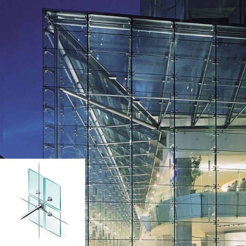Spider fittings (steel connectors) hold the glass panels firmly at fixed points. - Strong Support Structure